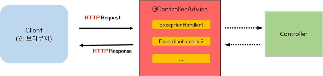 - @ExceptionHandler가 붙어있는 메서드는 Controller에서 예외가 발생했을 때 호출되며, 해당 예외를 처리하는 로직을 담고 있음