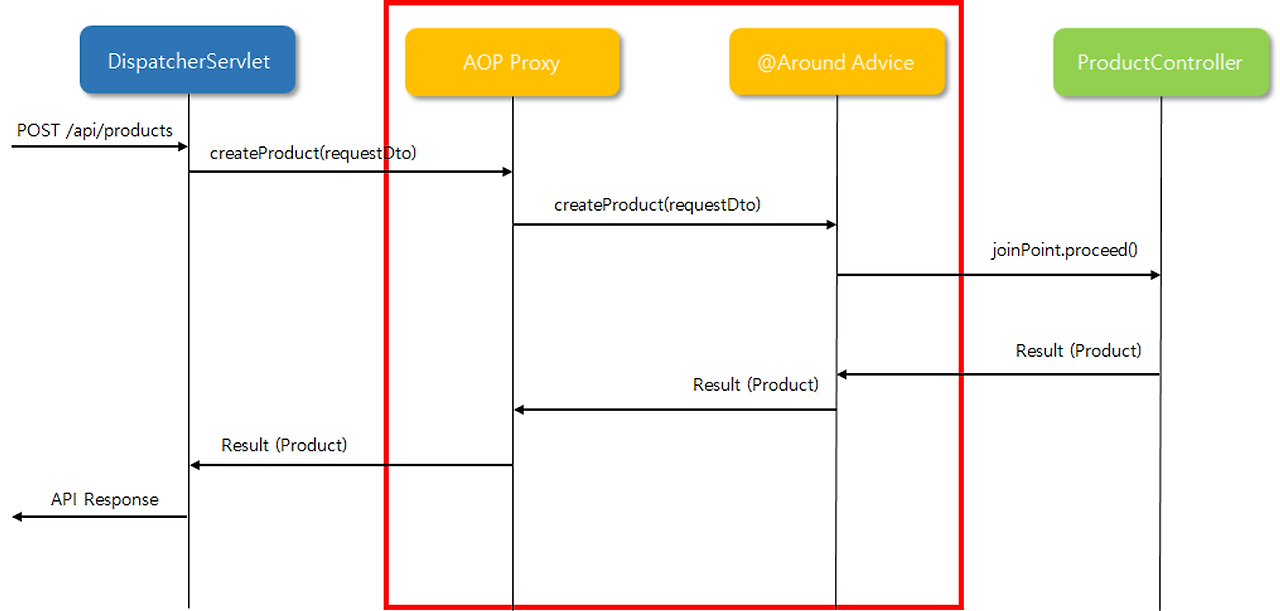 - "joinPoint.proceed()" 에 의해서 원래 호출하려고 했던 함수, 인수(argument)가 전달됨 → createProduct(requestDto);