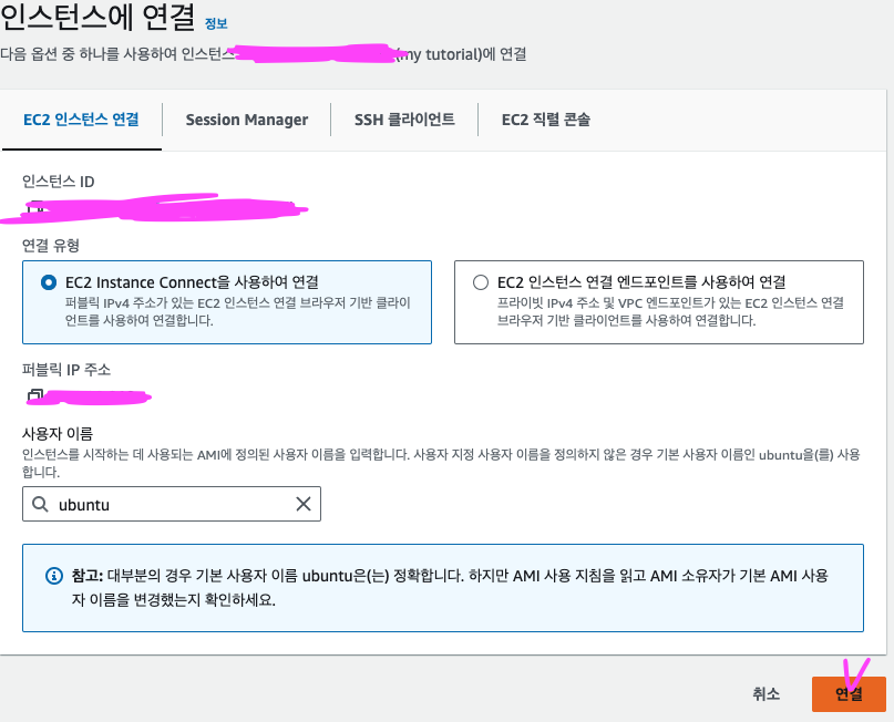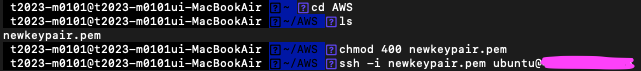 → newkeypair.pem 키 파일을 사용하여 ubuntu 사용자로 지정된 원격 서버(공용 IP 주소가 [public IPv4주소]인 서버)에 SSH를 통해 접속!
