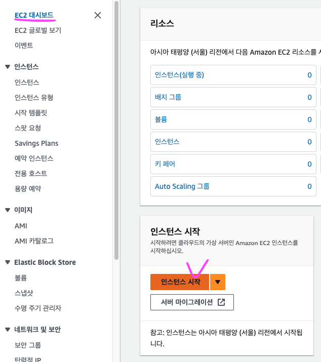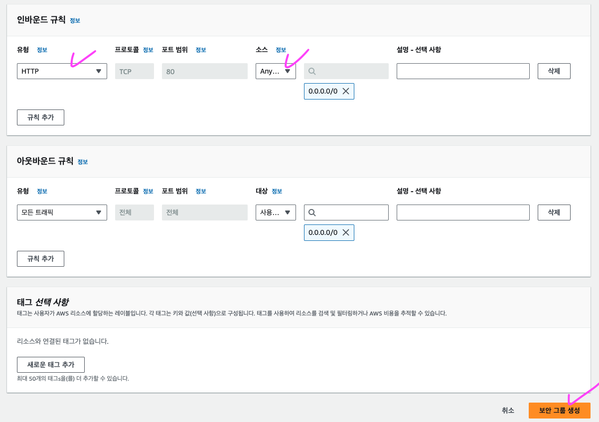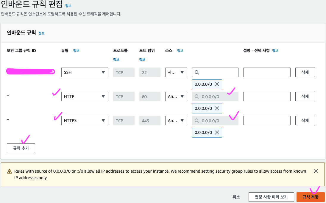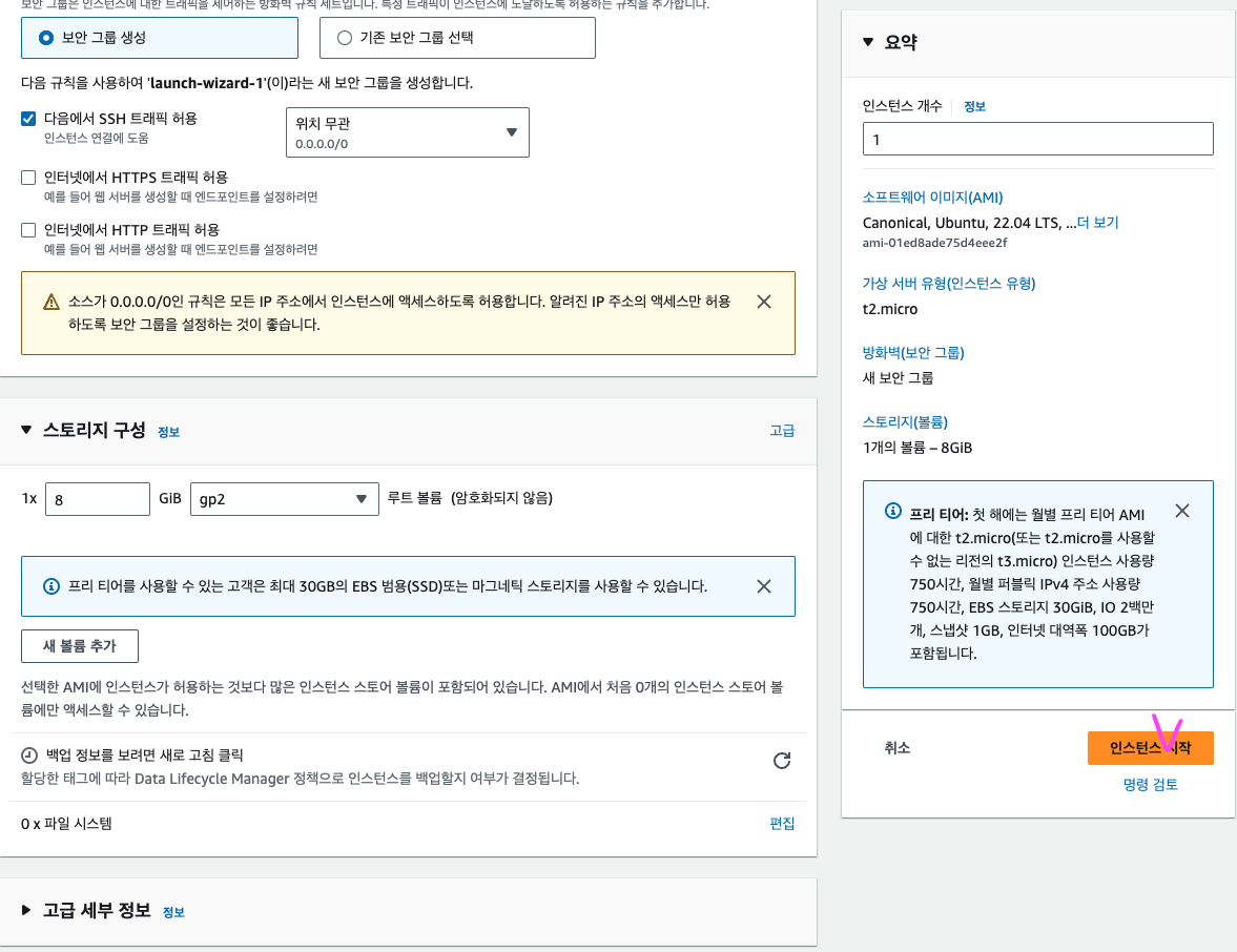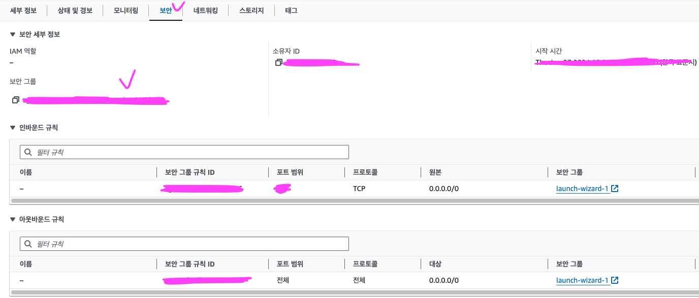 - 22 = ssh(secure shell)로 인스턴스에 원격 접속