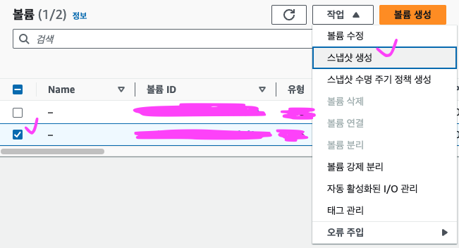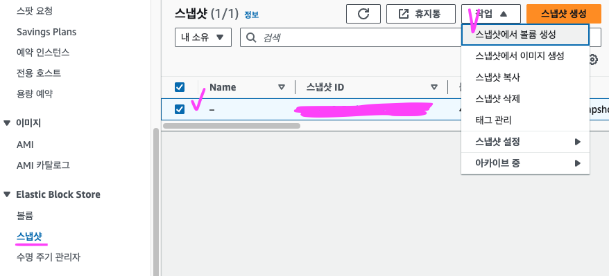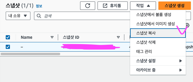 - 스냅샷은 EBS 볼륨의 상태를 복원할 때 사용되며, 이전 상태로 데이터를 복원하면 해당 스냅샷을 기반으로 새로운 EBS 볼륨이 생성됨