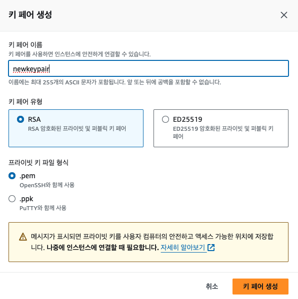 - newkeypair.pem은 개인 키 파일로, 이는 원격 서버의 사용자 인증에 사용됨