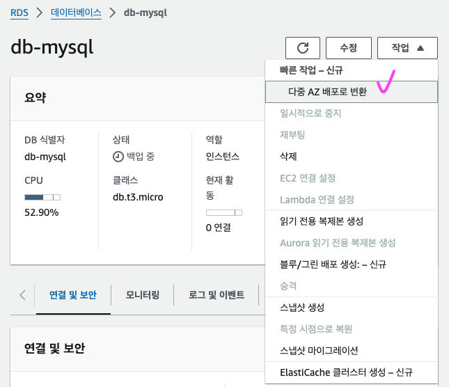 기존 db 지울 필요 없이 바로 다중 AZ 배포 변환 가능